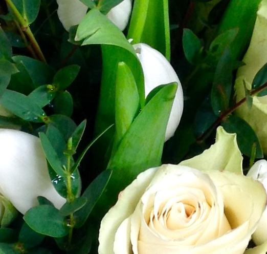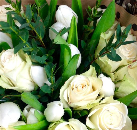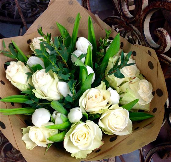 Stylish compact bouquet with white white roses and white and cream flowers chosen by florist.