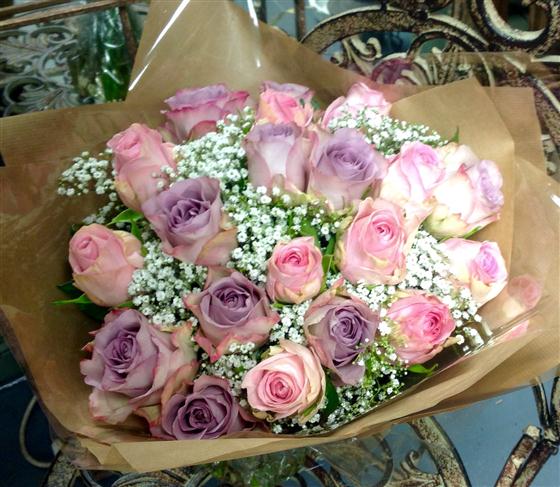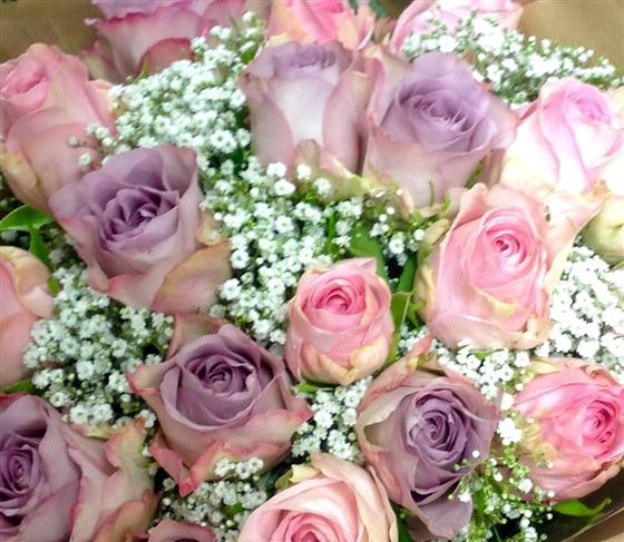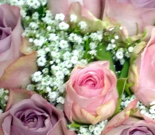 Very pretty bouquet including lilac roses, pale pink roses and gypsophila.