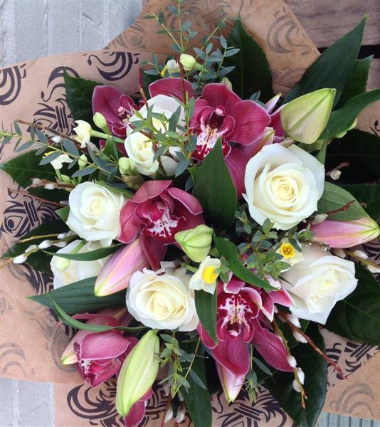 Classy display of roses, lilies and orchids.