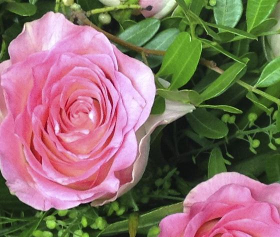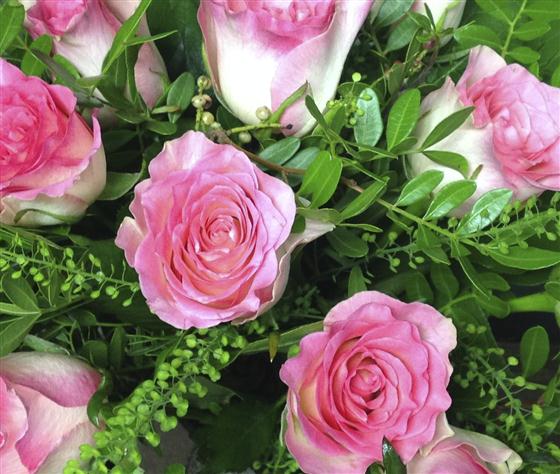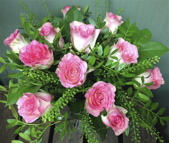 A number of fine and dandy long lasting pinky roses, encased in mixed dark green foliage.