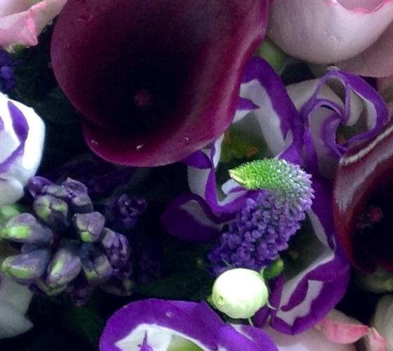 Stunning purple shades in this bouquet. Including roses, lisianthus, calla lilies and other seasonal purple flowers.