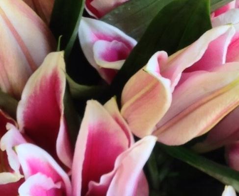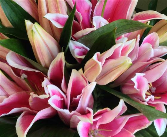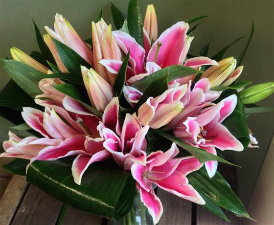A beautiful, highly perfumed bouquet of pink stargazer lilies and modern foliage.
