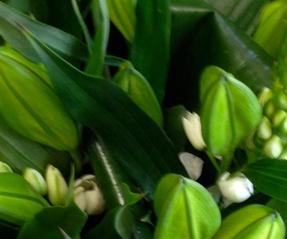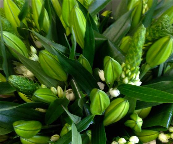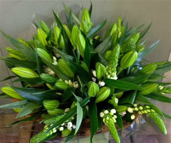 An opulent display of scented, white oriental lilies and stars of Bethlehem presented as an aqua packed bouquet.