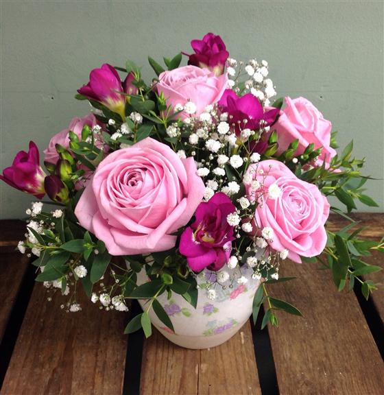 Pink roses and cerise freesias in an Antique-white pot elegantly decorated with pink & lilac blooms & foliage & distinctive French crest; vintage-style crackle glaze effect finish with natural unglazed plain base.