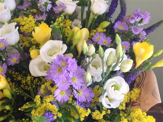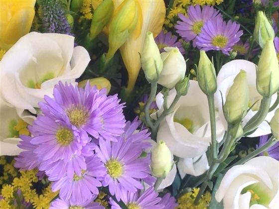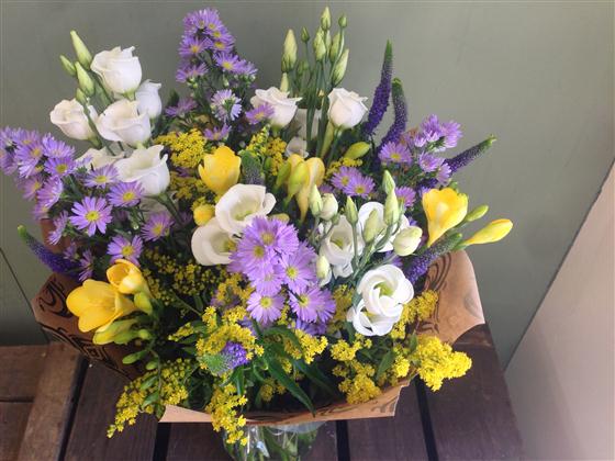 Yellow freesias, white lisianthus, blue veronica and September flower make a pretty all year round reminder of hazy summer days.