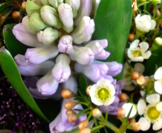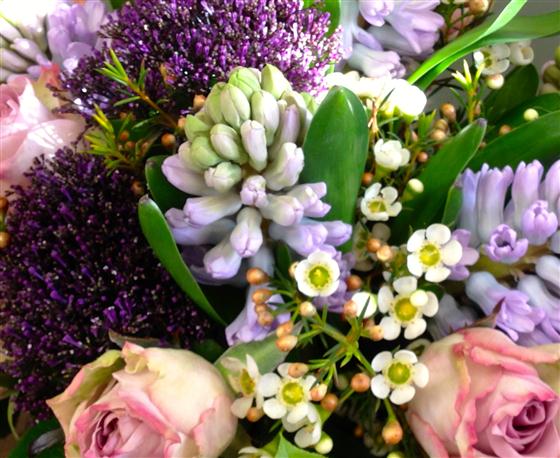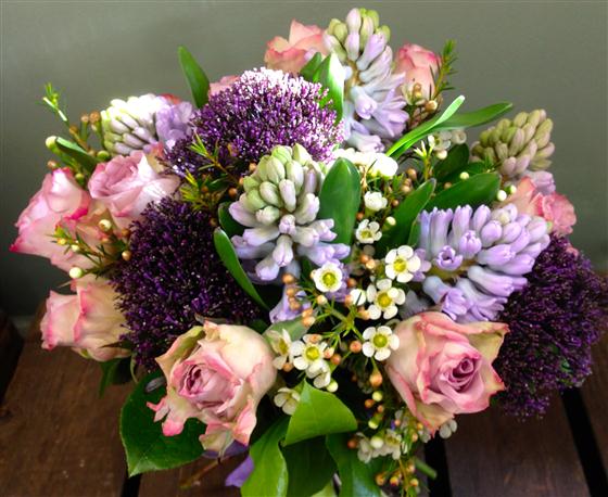 A combination of scented spring hyacinths and roses in vintage style shades.
