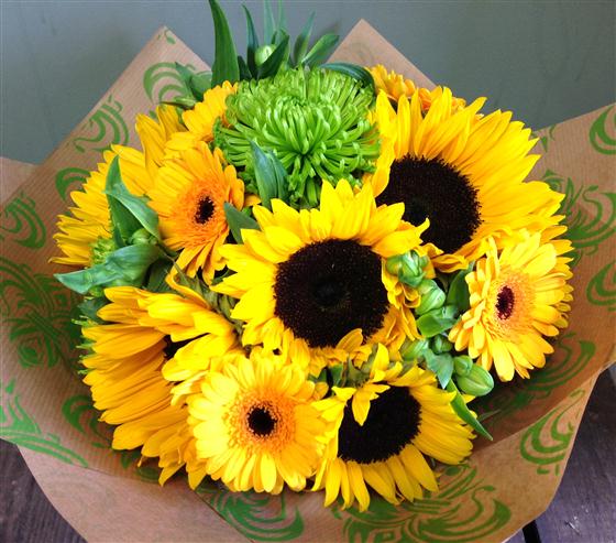Stunning display of bright smiling sunflowers, germinis and green anastasia blooms.