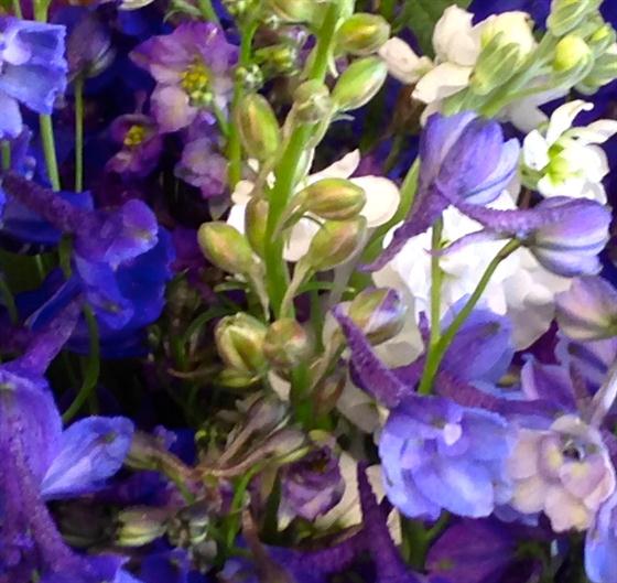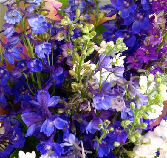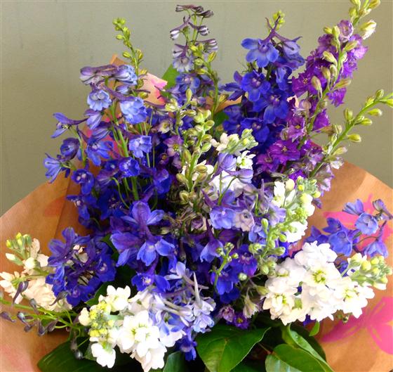 A true taste of summer, blue delphiniums, larkspur and stocks create an impressive traditional style bouquet.