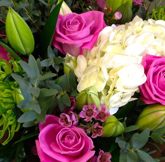 A fragrant hand-tied bouquet of pink aqua roses, oriental lilies, delicate pink wax flowers and green single chrysanthemums presented in a stylish wrap.