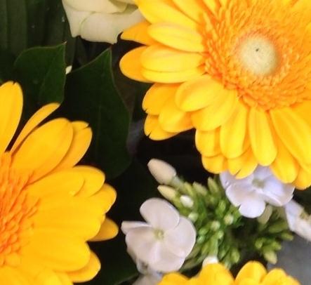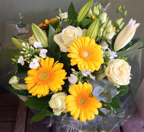 Bold yellow gerberas are the focal point of this dazzling bouquet including white roses, scented lilies, phlox and lisianthus.