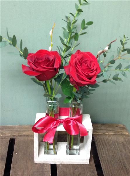 Unique Wooden crate with a pair of bud vases with red roses and eucalyptus.