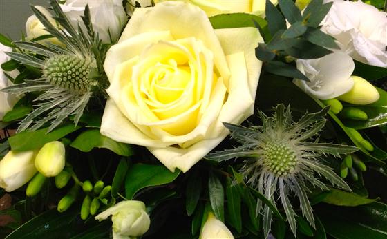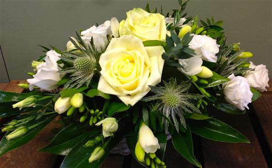 A traditional basket arrangement in creams and whites including roses, lisianthus and scented freesias.